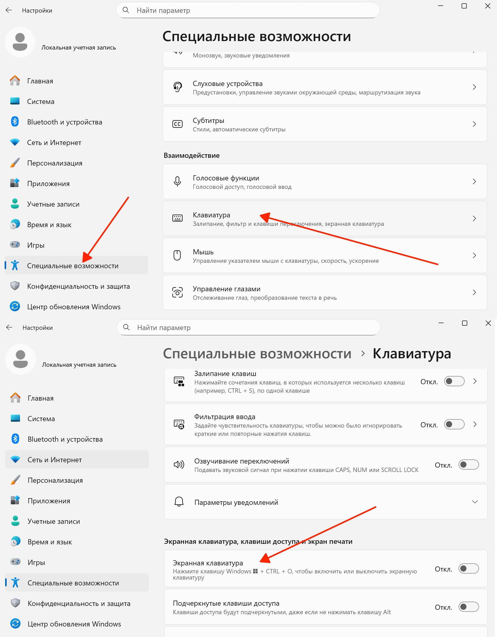 Пуск-Настройки-Специальные возможности-Клавиатура. - Используется внешняя USB или Bluetooth-клавиатура.